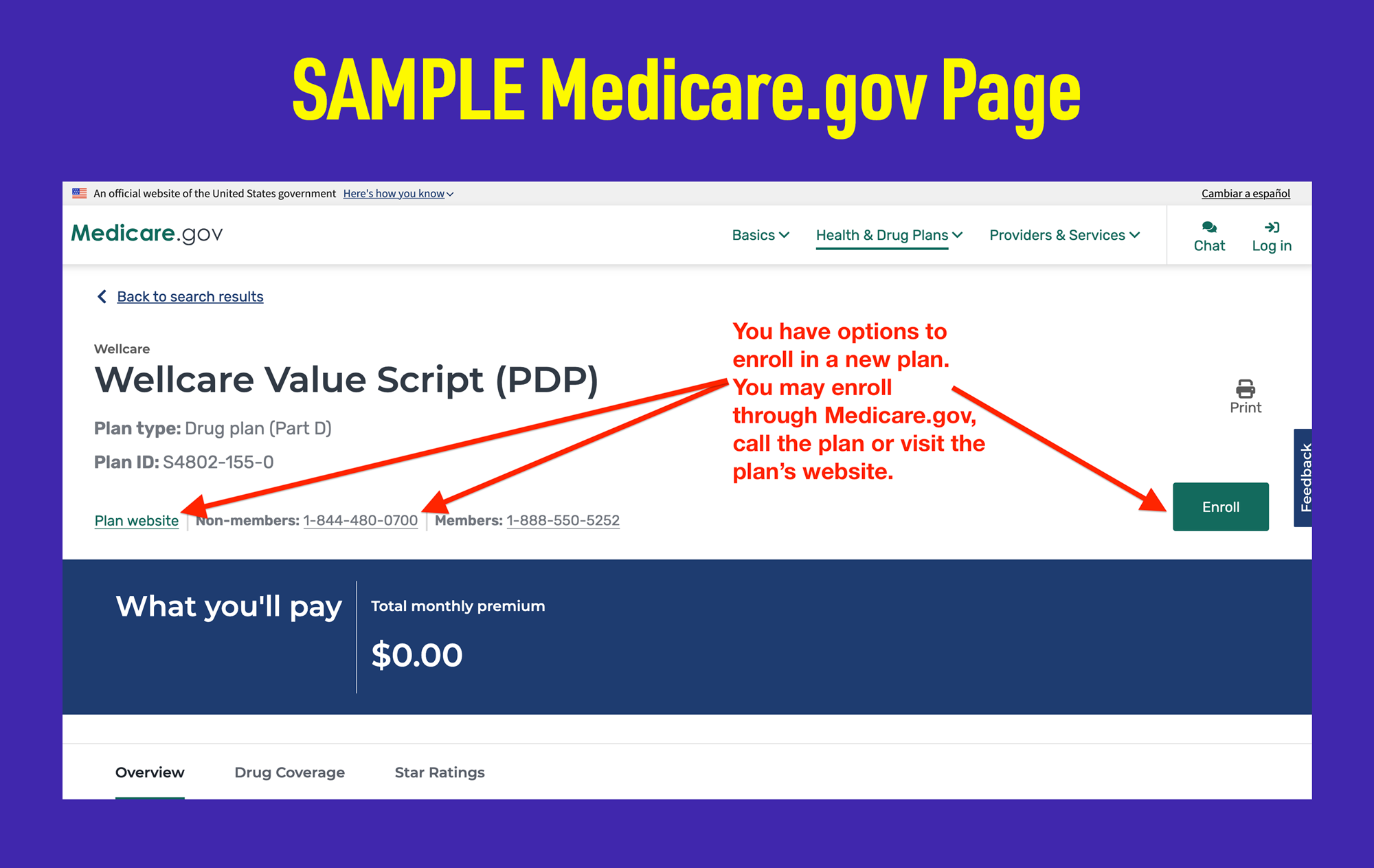 At Medicare.gov, choose your preferred methods to enroll in the new plan. You may choose to use Medicare.gov's enroll feature, call the plan, or visit the plan's website.