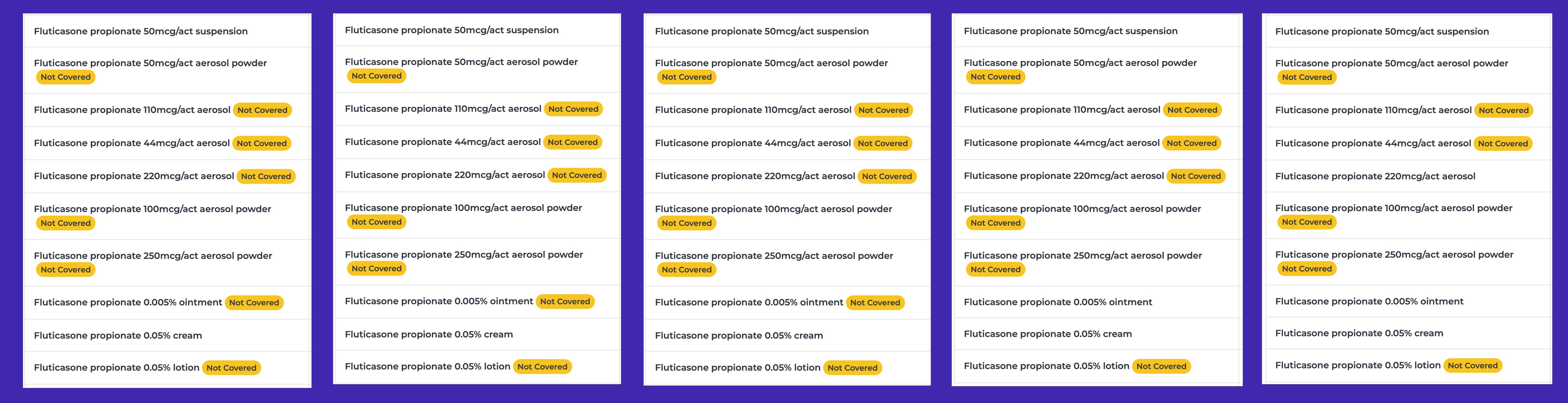 (See the example below showing several versions of fluticasone propionate and their coverage statuses across multiple Part D plans.)