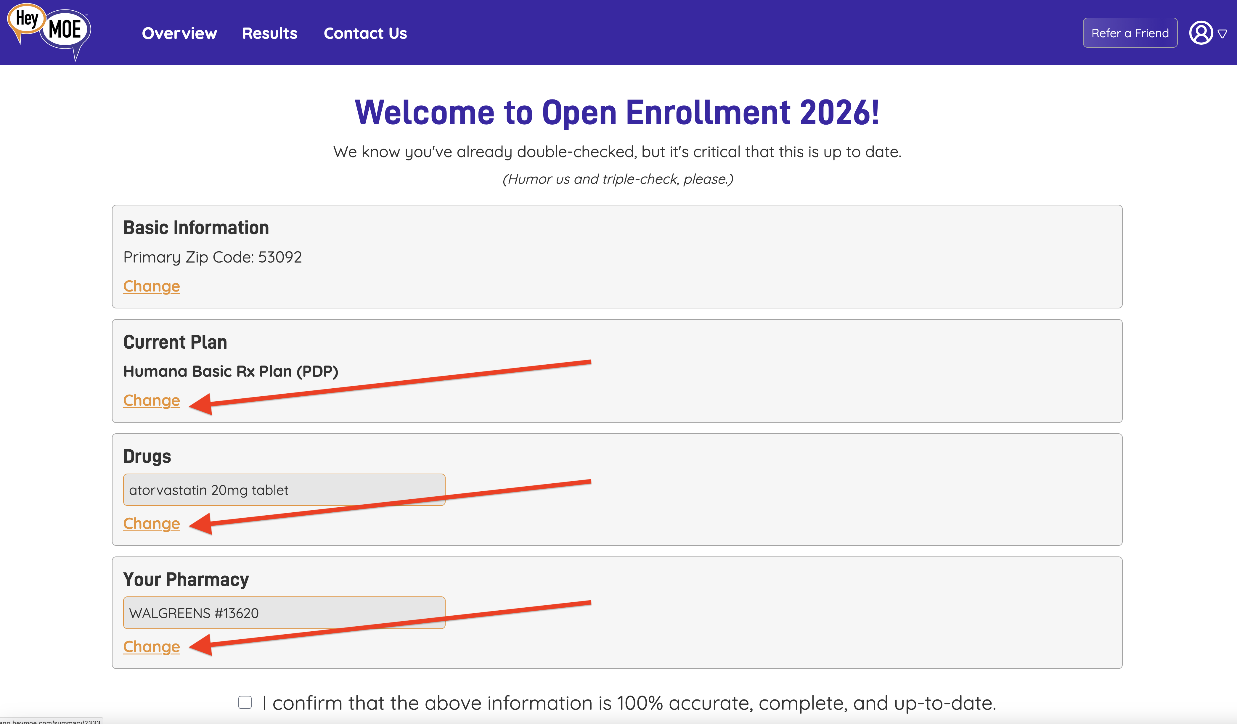 Then, once logged in, you'll be presented with a screen the allows you to double-check all the information you've previously entered into HeyMOE. If any of the information is incorrect, you can change it by clicking on the orange "Change" link beneath the element you need to change. (See the screenshot below)